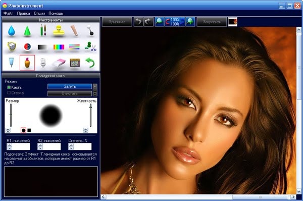 RePack by elchupacabra PhotoInstrument - простой в освоении редактор для обработки цифровых фотографий, предназначенный, в первую очередь, для ретуширования портретных изображений. Предлагает множество интуитивно понятных инструментов для редактирования фотографий (удаление красных глаз, сглаживание морщин, увеличение чёткости, коррекция цвета и др.) для придания портрету "гламурного" качества и желаемой привлекательности. Поддерживает редактирование PSD файлов и сохранение во всех популярных форматах .jpg, .png, .bmp и т.д. Возможность пакетного изменения изображений.