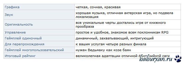 В целом, картина более чем приятная. Авторы детально воссоздали вселенную «Ведьмака», великолепно проработали персонажей (чего только стоит извечный цинизм Геральта) и не забыли о ссылках на книгу – вы не раз услышите знакомые имена и рассказы об известных событиях. К тому же в игре много интересных квестов, а полное прохождение занимает около 40 - 50 часов. Боевая система, алхимия, медитация, древо умений – всё это смело можно записывать в плюсы. А минусы хоть и есть, но мизерны, поэтому настоятельно советуем примерить на себя образ Ведьмака хотя бы на пару дней – должно понравиться.